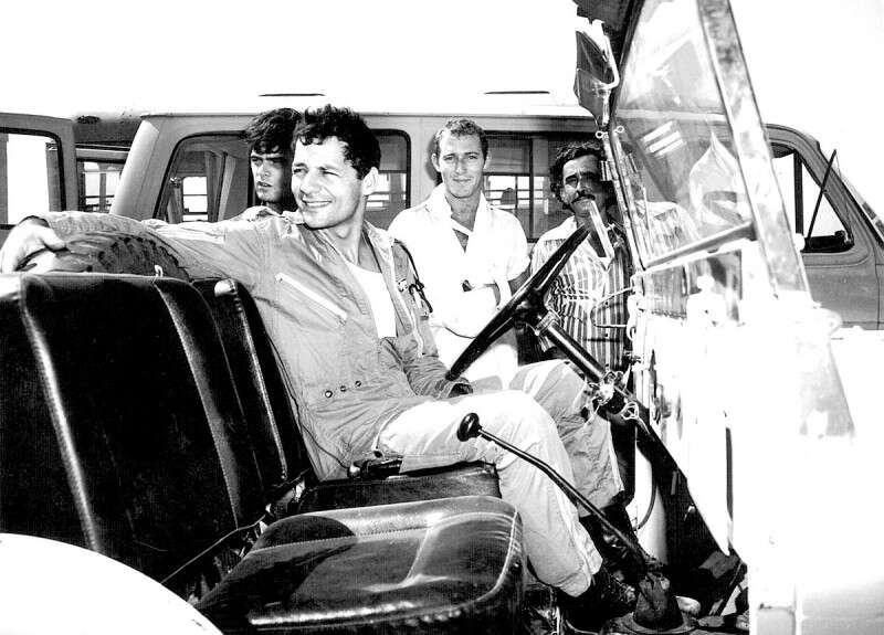יערי (לבוש לבן, חבוש), עם חזרתו לטייסת לאחר הפציעה. יושב: המפקד, יפתח ספקטור