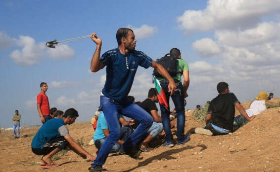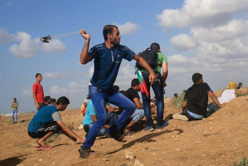 פלשתיני מיידה אבנים בהפגנה בעזה, היום (צילום: אי.אף.פי)