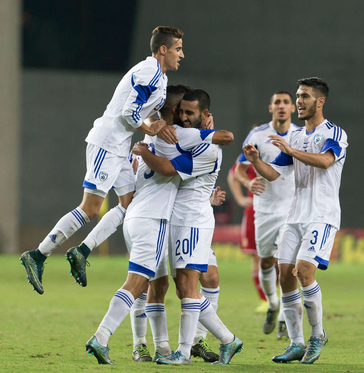 צילום: עודד קרני // שחקני הנבחרת הצעירה של ישראל חוגגים ניצחון הערב במושבה