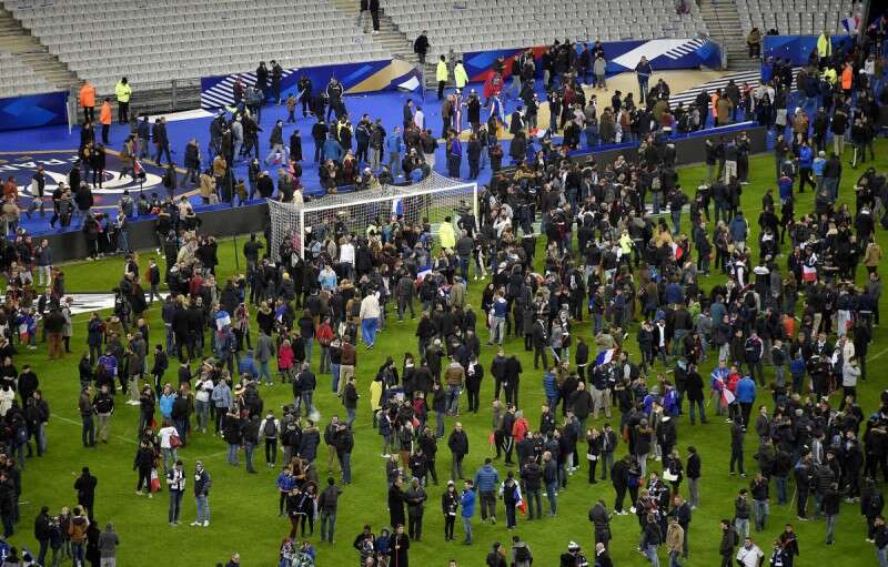 האוהדים על כר הדשא לאחר הפיגוע מחוץ לאיצטדיון // צילום: אי.אף.פי
