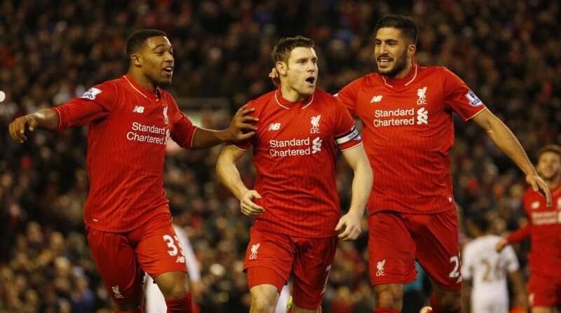 ג'יימס מילנר (במרכז) חוגג את השער שלו באנפילד // צילום: אי.פי