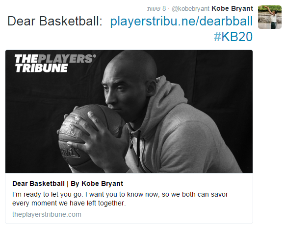 "לעד אודה לך ואוהב אותך על שהגשמת את חלומי להפוך לשחקן של הלייקרס, אבל האהבה האובססיבית שלי לא יכולה להישאר לנצח. העונה אני נותן את כל מה שעוד נשאר בי. הלב שלי מסוגל לעמוד בשחיקה, הגוף יכול להתמודד עם העבודה הקשה, אבל הגוף גם יודע שזה הזמן להיפרד. וזה בסדר. אני מוכן לשחרר אותך מחיי. אני רוצה שתדע את זה עכשיו, כדי שנוכל להיזכר בכל הרגעים שחלקנו יחד. הטובים וגם הרעים. הענקנו אחד לשני כל מה שיכולנו. ושנינו יודעים שלא משנה מה אעשה בעתיד, תמיד אהיה הילד עם הגרביים שקולע לפח אשפה בפינה. זה שמדמיין איך הכדור אצלי בידיים כשנותרו חמש שניות לבאזר. אוהב אותך תמיד, קובי".