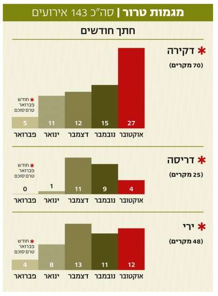 הוא מדבר בגילוי. על ההצלחות, ועל הכישלונות. בצד השלילה - תחושת הביטחון של התושבים. העובדה שהם חוששים בבית, והם חוששים על הצירים. משהו יסודי מאוד התערער, וגם כל הכוחות והתגבורים לא מצליחים לייצב אותו. בצד החיוב - הירידה בהיקף האירועים. הנתונים היבשים שונים מהתחושה הציבורית: בכל הפרמטרים יש ירידה. באוקטובר היו 27 ניסיונות דקירה, בנובמבר 15, בדצמבר 12, בינואר 11 ומאז ראשית פברואר - 5. מגמה זהה נרשמה גם בפיגועי הירי והדריסה.