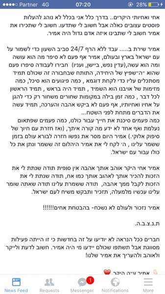 "אני אוהב אותך אהבה אינסופית", כתב אחיו של אמיר כתב פוסט לזכרו, "תודה שנתת לי את הזכות להכיר ולאהוב אותך כמו אח. תודה שנתת לי את הזכות לקבל ממך אהבה. אמיר עבד מסביב לשעון כדי לשמור על עם ישראל בארץ ובעולם. אף פעם לא אמר מה הוא עושה, ורק חבריו לעבודה סיפרו שהוא ה'שפיץ' של היחידה. כמה פעמים סיכנת את עצמך עבור כולנו, ואף פעם לא סיפרת... תודה ששמרת עלינו, ותודה שאתה שומר עלינו עכשיו, מלמעלה".