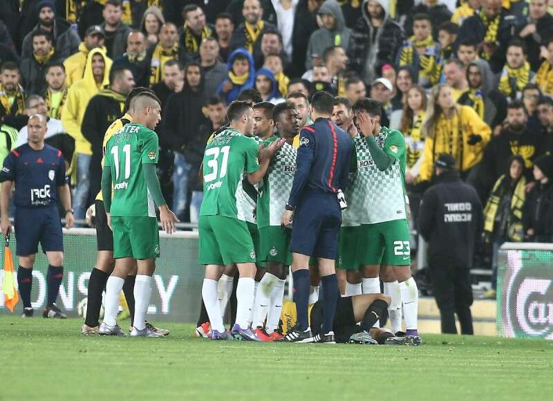 שחקני מכבי חיפה מנסים לשכנע את חכמון שלא לתת ללביא אדום // אלן שיבר