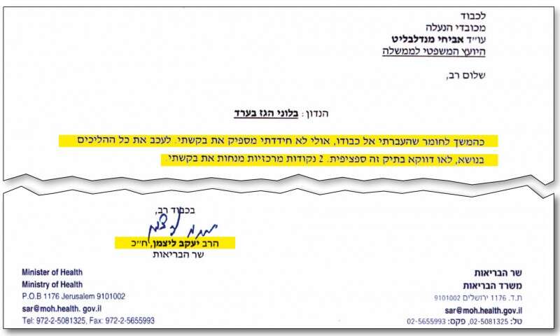 שר הבריאות, מתברר, התערב אישית אצל היועץ המשפטי לממשלה, עו"ד אביחי מנדלבליט, בניסיון למנוע הגשת ערעור באחד מתיקי פרשת בלוני הגז. מדובר בתיק שבו הורשע איש חסידות גור בבית משפט שלום, זוכה בערעורו במחוזי וכאשר החליטה העירייה להגיש בקשת רשות ערעור לעליון - פנה ליצמן לפני שלושה שבועות למנדלבליט במכתב אישי (ראו מסמך) וביקש את התערבותו.