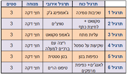 האימון מורכב משישה תרגילים, את כל אחד מהתרגילים נבצע לאורך שלושה סטים, כאשר כל תרגיל מורכב מתרגיל כוח ותרגיל אירובי.
