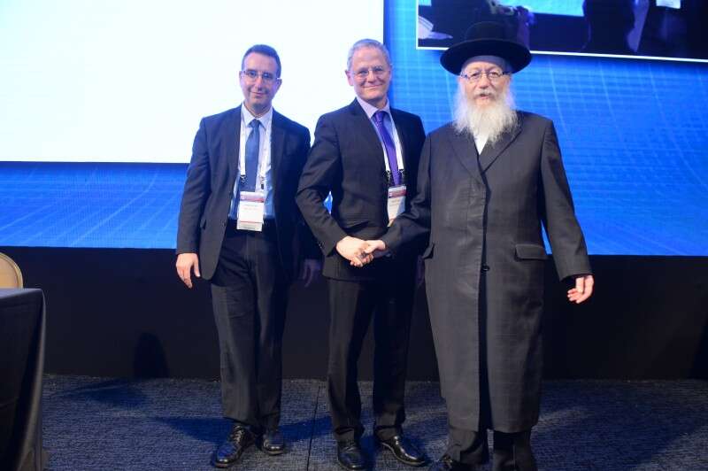 השר ליצמן עם פרופ' מיכאל גליקסון (במרכז) ופרופ' רונן רובינשטיין // צילום: חן דמארי