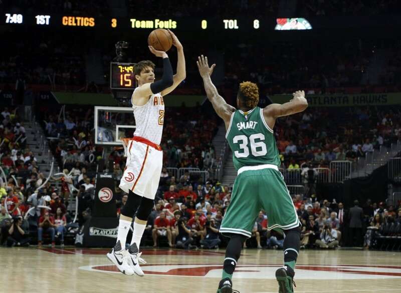 קייל קורבר בדרך לעוד שלשה מול בוסטון // צילום: USA Today Sports