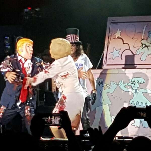 רגע השיא של המופע היה עריפת ראשו של קופר בעזרת גיליוטינה על הבמה - אחד הפעלולים המזוהים עימו עוד מהופעותיו בסוף שנות ה-60. קופר סיפק גם כמה גרסאות כיסוי לחברים מעולם הרוק והמטאל שהלכו לעולמם ובהם דיוויד בואי ולמי קילמייסטר סולן מוטורהד, שנפטרו בשנה שחלפה. ההופעה הסתיימה בשיר ״elected" כשדמויותיהם של דונלד טראמפ והילארי קלינטון כגופות חיות ליוו את קופר על הבמה.