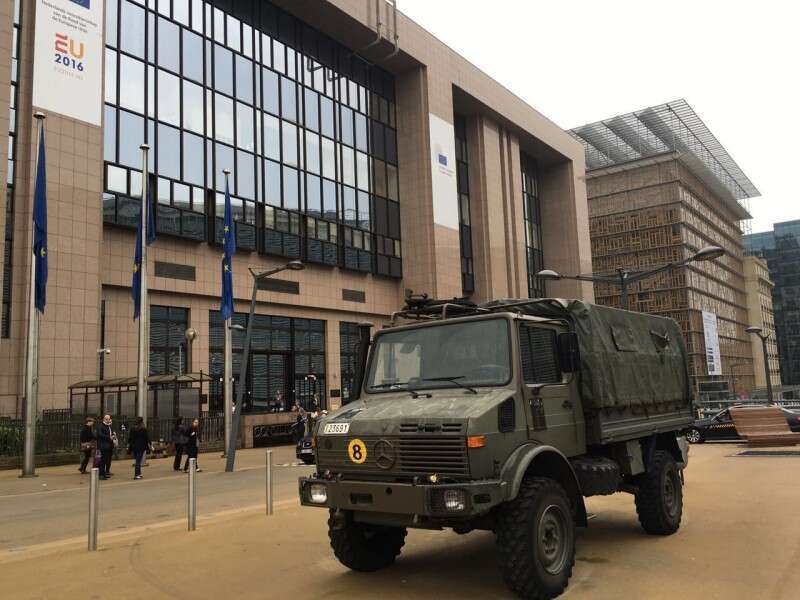 רכב צבאי בין בנייני מועצת האיחוד האירופי ונציבות האיחוד האירופי בבריסל // צילום: יורי ילון