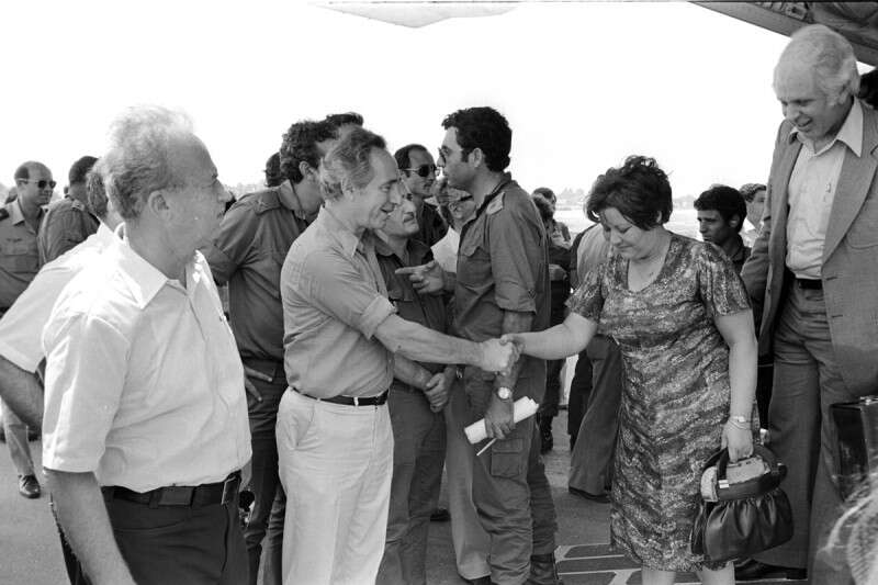 יצחק רבין ושמעון פרס עם החטופים לאחר השחרור // באדיבות ארכיון צה"ל במשרד הביטחון
