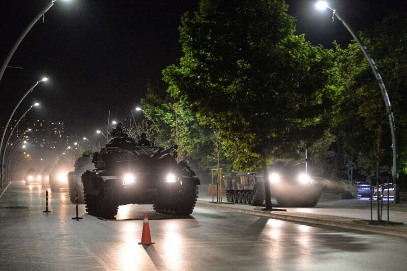 00:08. טנקים מקיפים את את הפרלמנט הטורקי ופותחים באש. במקביל, מדווח על ירי בנמל התעופה אטאטורק באיסטנבול.
