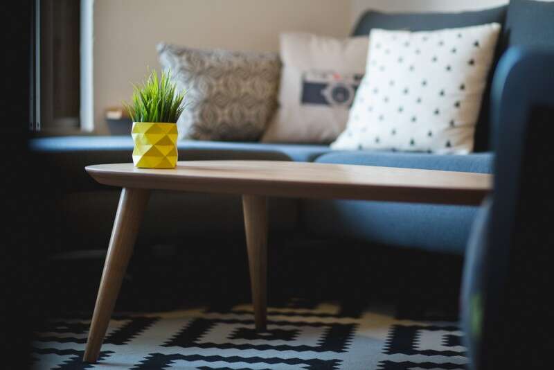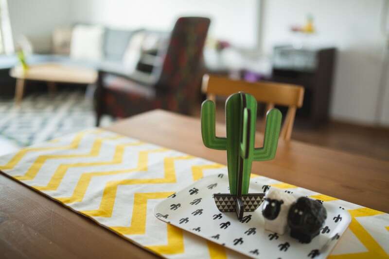 ההשקעה בפרטים הקטנים ניכרת בכל מקום, כאשר גם המנורות ואפילו העציצים על השולחן קיבלו אופי גאומטרי ומוקפד. להשלמת המראה הגרפי, הוסיפו כריות בעלות הדפס איורי. כדי להכניס לסלון צבעוניות נוספת הוסיפו פרחים מפלסטיק שהונחו על שרפרפי וינטג' מימי קום המדינה, גם הם מבית הסבא והסבתא של תומר.