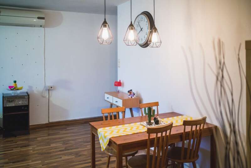 אל האהבה של בני הזוג לאסתטיקה ועיצוב מצטרפת גם חיבה עזה לאוכל טוב. לכן, אל פינת האוכל הסטנדרטית מעץ הוסיפו שלישיית גופי תאורה נמוכים בעלי נורות פחם, המעניקות לפינה אווירה חמימה וסטייל לארוחות המושקעות שהם מקפידים להכין ביחד.