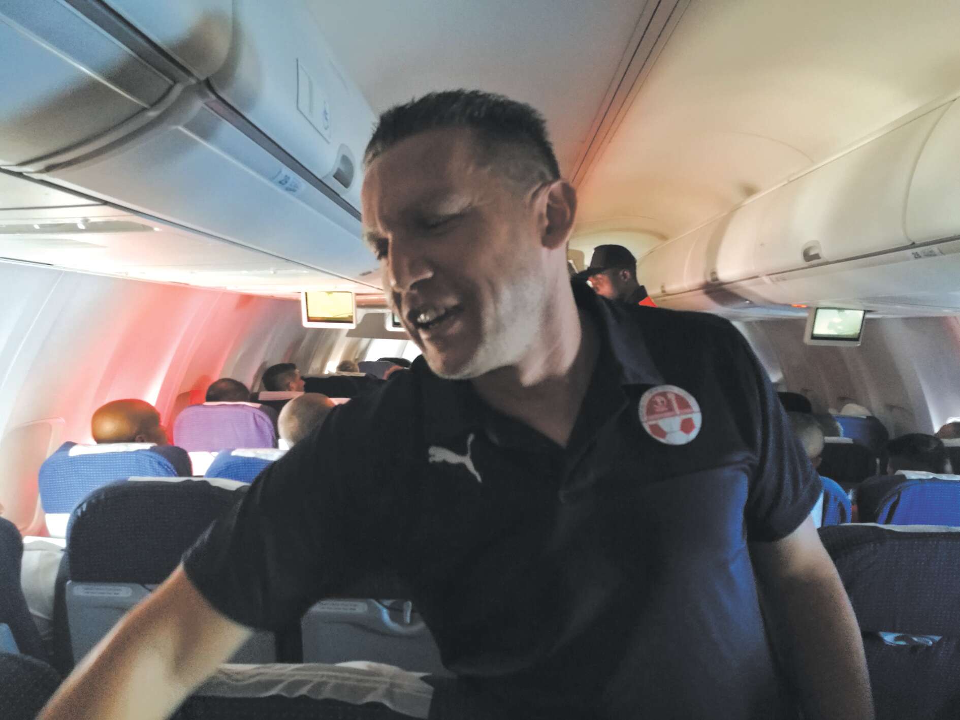 מייד עם העלייה למטוס הציג את עצמו הטייס שמשון סויסה כבאר־שבעי גאה. "אני הוא זה שהביא את המזל והטיס את הקבוצה ליוון למשחק מול אולימפיאקוס ואני אהיה זה שייקח אותה גם לגלאזגו", הוא אמר בהתרגשות בקשר. השחקנים מחאו כפיים כאילו המטוס כבר נחת בארץ אחרי הניצחון, וגם הדיילות הודו שהופתעו הפעם.