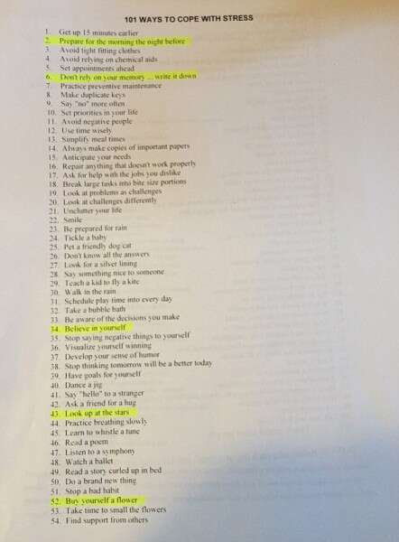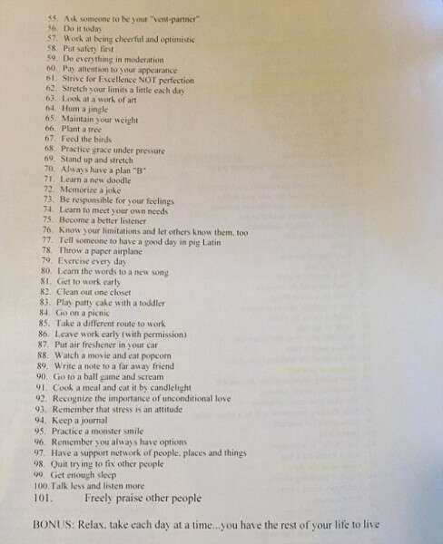 המורה טען כי הוא הצליח להרכיב רשימה זו לאורך השנים מספרי הלימוד וממאמרים, ולטענתו, מדובר ב"דברים שרוב האנשים יכולים לעשות כדי לחיות חיים פחות מלחיצים".