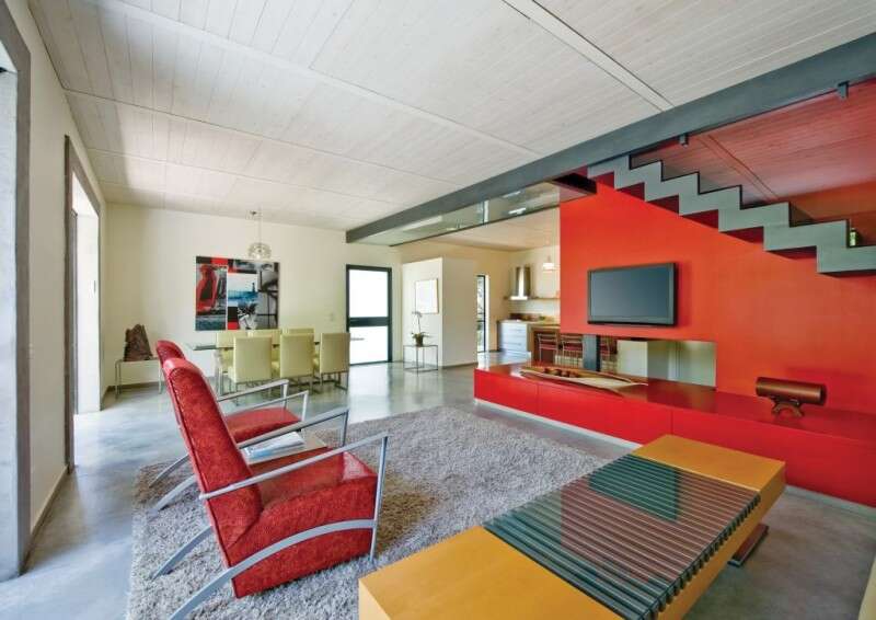 מדובר במבנה מרשים, בו כל פרט זועק את טעמו ונגיעתו העיצובית המקורית של בן צבי. מוקד זה בביתו הינו בפירוש אלמנט אדום בוהק, הממוקם בסלון הבית וחובק גרם מדרגות ממתכת המשולב מעקה זכוכית שקוף, בעל מראה פיסולי.