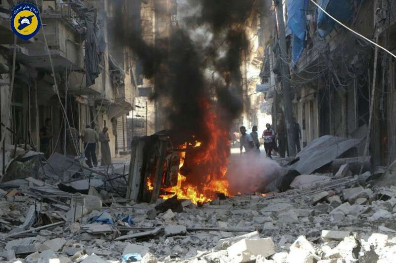רשת אל־ג'זירה דיווחה כי מטוסים של חיל האוויר הסורי פיזרו כרוזים מעל חאלב, ובהם נקראו התושבים התומכים במשטרו של הנשיא בשאר אסד לעבור לצידה המערבי של העיר, הנשלטת בידי חיילי הכוחות הנאמנים לאסד. עדי ראייה דיווחו שמטוסי הקרב הרוסיים והסוריים הפציצו את חלקה המזרחי של העיר, הנשלט בידי המורדים, ושכונות שלמות במזרח חאלב הפכו לעיי חורבות.