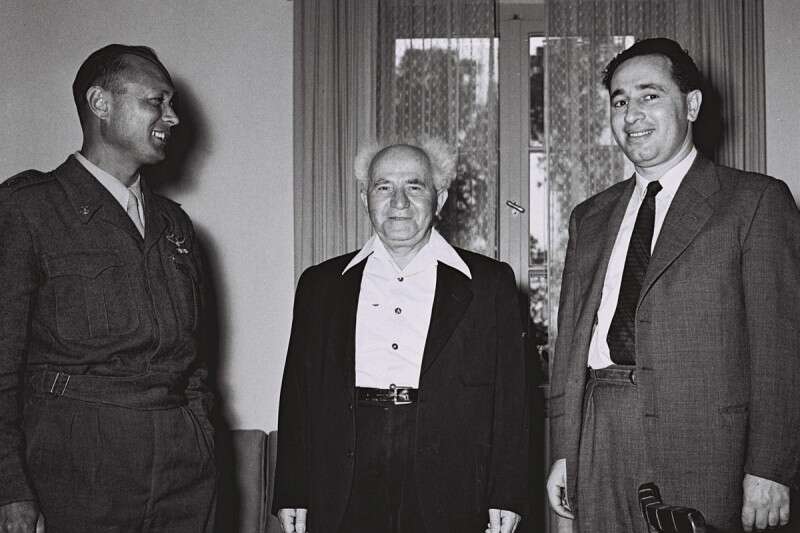 תרומה ביטחונית. כסגן שר הביטחון עם רה"מ בן גוריון והרמטכ"ל דיין // צילום: לע"מ