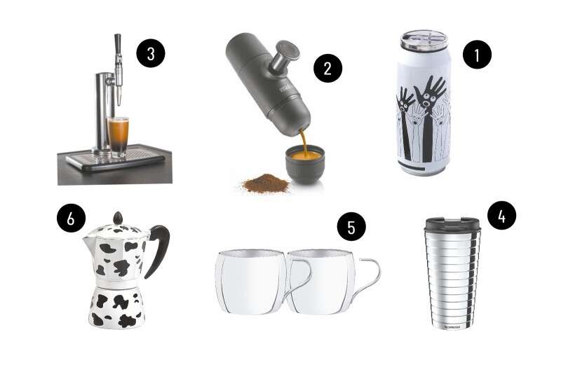 1. ספל תרמי מעוצב, ג'נטלמן 59 ש'; 2. אספרסו גם בשטח, idgu.co.il 330 ש'; 3. כמעט כמו לשתות בירה, קופי סטיישן 17-14 ש'; 4. ספל קפה לדרך מסידרת Citiz, נספרסו 79 ש'; 5. 2 ספלי נירוסטה - טרמונטינה, כרמל דיירקט 185-156 ש'; 6. מקינטה מעוצבת, הרמוניה לבית 50 ש'