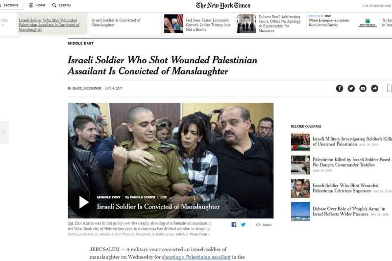 בדומה, הכותרת המקורית של אתר העיתון "ניו יורק טיימס" היתה: "אלאור אזריה, חייל ישראלי שירה בפלשתיני פצוע, נמצא אשם בהריגה". ארגון "קאמרה" הפרו־ישראלי טען אתמול כי עורכי העיתון שינו את הכותרת בעקבות פנייתם ל"חייל ישראלי שהרג תוקף פלשתיני פצוע הורשע בהריגה". בתוכן הידיעה נכתב בין השאר כי "לקראת ציון 50 שנים לכיבוש הישראלי בשטחים, המשפט הטעון העצים את הדיון על האתיקה הצבאית ועל מקומו של צה"ל בחברה הישראלית. המשפט עסק במידה לא פחותה במערכת הערכים של צה"ל... רבים בישראל, מדינה שבה השירות הצבאי הוא חלק מהזהות הלאומית, קראו לגבות את החיילים הצעירים הנשלחים למשימות מסוכנות". ארגון "קאמרה" ציין גם כי סוכנות הידיעות AFP שינתה את כותרת הדיווח שלה בעקבות הפנייה שלהם.