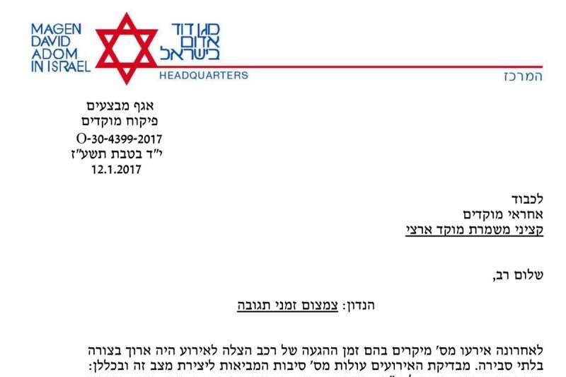 במד"א מציינים כי זמן ההגעה הממוצע של רכב ההצלה צריך להיות עשר דקות, וכי לאחרונה אף הוסיפו במערכת הבקרה והשליטה התראה כאשר זמן ההגעה ארוך מזמן זה. עוד נמסר כי "כבר היום זמני התגובה של מד"א מהמהירים בעולם. עם זאת, כארגון ההצלה הלאומי, מד"א מבצע באופן עצמאי ביקורות תקופתיות בשלל תחומים מפעילותו, וזאת במטרה תמידית להמשיך ולהשתפר ולצמצם את זמני התגובה והטיפול ולרענן בהתאם את נוהלי העבודה. המכתב פורסם במסגרת זו ואינו שונה מהנחיות אחרות שמרועננות מעת לעת".