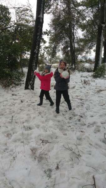 שחר ושני שומר משחקות בשלג בשמורת מירון // צילום: אילנה שומר