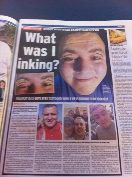 חייב ללכת לגמילה: סטיבן לברטי (24) מבלפסט שבצפון אירלנד לא ישכח את המעשה המטופש שעשה, בעיקר בגלל שתישאר לו תזכורת תמידית, ממש מעל העיניים. לאחר שלושה ימים רצופים של שכרות בעת חופשה בספרד, מצא את עצמו סטיבן מתעורר עם מזכרת "נחמדה" – קעקוע על העפעפיים.