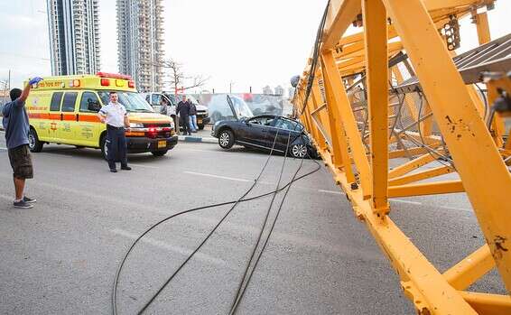 מנוף בגובה עשרות מטרים קרס אתמול על כלי רכב בבת ים. מפעיל המנוף נפצע קשה ועוד שלושה עוברי אורח, ובהם ילדה כבת 9, נפצעו קל עד בינוני.