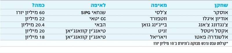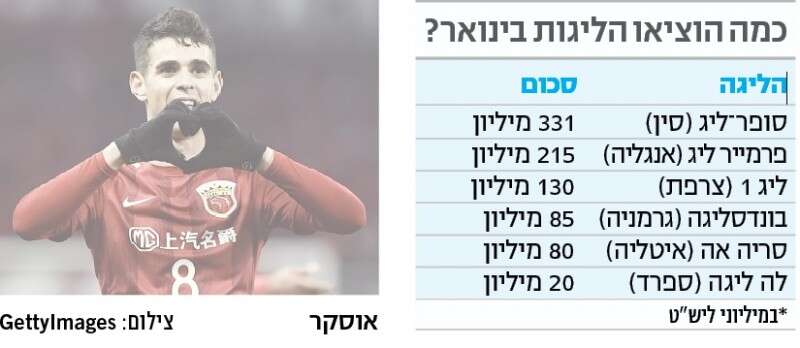 1. את אנחת הרווחה ששיחררו מועדוני הכדורגל הגדולים באירופה בליל יום שלישי, היה אפשר לשמוע עד סין. חלון ההעברות של הסופר־ליג, שתצא בסוף השבוע לדרך, נסגר, והתמנון מהמזרח הרחוק נאלץ לקפל את זרועותיו הארוכות ולהסתפק במה שהשיג. השלל, חייבים להודות, לא היה רע בכלל. בשל חוקי הליגה החדשים, שתכף נגיע אליהם, נאלצו המועדונים הסיניים לוותר על שמות כגון דייגו קוסטה, וויין רוני, רדאמל פלקאו, אדינסון קבאני ואחרים, אך זה לא אומר שנפתחה שם קופת חיסכון, להפך. 331 מיליון ליש"ט השקיעו בינואר הקבוצות הסיניות, גבוה יותר מהסכום שהוציאה הפרמייר ליג הפזרנית ופי 17 מהליגה הספרדית המתונה.
