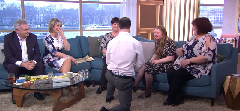 אירוסין מרגשים לעיניי המצלמה. בני זוג בריטים, ניקי וויאט וסמנתה לוקרי, אשר סובלים מסתמונת דאון, הגיעו להתארח בתכנית "הבוקר הזה" בערוץ ITV בשידור חי. כשלצידם אמהותיהם ג'קי וקים, הזוג סיפר על כך שנאסר עליהם להתנשק בבית הנוער בו שניהם נהגו לבלות ובו הם הכירו. כשהראיון התקרב לסיום, לניקי הייתה הפתעה. הוא כרע ברך והציע לחברתו להנשא לו.