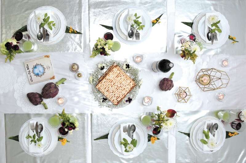 עוד על השולחן: מפה חד־פעמית לבנה, כוסות פלסטיק גבוהות עם זרי פרחים אישיים לכל סועד, קערה חד־פעמית למצות, מפיות עגולות חד־פעמיות, 5 כוסות נמוכות ובהן נרות כסופים - הנמל • שני פמוטים מוזהבים, גדול וקטן - H&M Home • הגדה - ניצחתי ואנצח • מלחייה ופלפלייה בצורת נורות חשמל - H&O • יין סירה 2013 - יקבי 1848 • מצות - אביב • פלייסמט מבד כסוף לכל סועד, עלי נענע, עלים ירוקים גדולים, פרחי אמנון ותמר טבעיים, חרציות, עדעד, גיבסנית ובבונג, 3 ראשי ארטישוק טבעיים