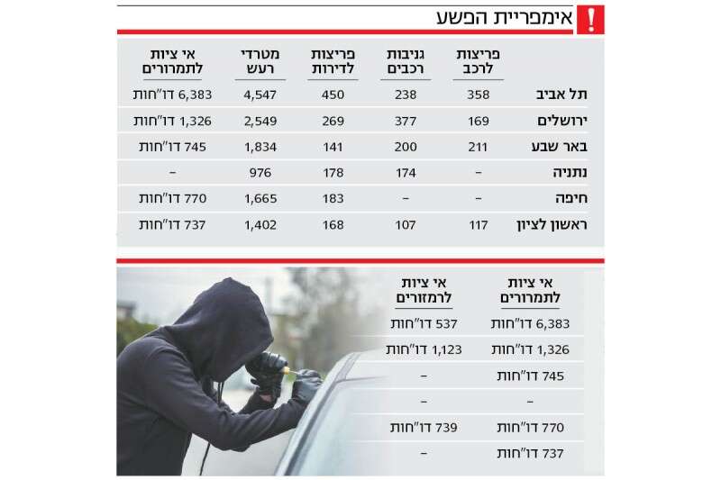 על פי הנתונים, בת"א התבצעו 358 עבירות של גניבה מתוך כלי רכב, בבאר שבע עומד המספר על 211, בירושלים על 169, בראשון לציון ובחולון על 117, ואחריהן בפתח תקווה עם 115 גניבות. בעבירת גניבת כלי רכב, ירושלים מובילה עם 377 גניבות מתחילת השנה, בת"א בוצעו 238 גניבות, בבאר שבע 200, בנתניה 174, בפתח תקווה 141 ובראשון לציון נגנבו 107 כלי רכב.