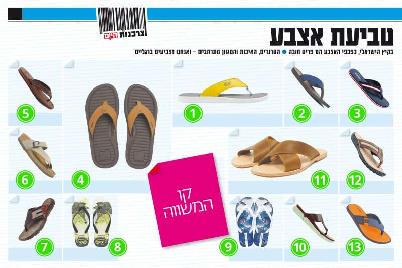 1. לה קוסט לרשת Shoester מחיר: 349 ש', 2. ALDO מחיר: 249.90 ש', 3. סקופ מחיר: מחיר 49.90 ש', 4. Reef מחיר: 219.90 ש', 5. קל גב 89 ש', 6. טבע נאות מחיר: 349 ש', 7. פלייפוט 259 ש' , 8. Havaianas מחיר: 90 ש', 9. איפנמה מחיר: 75 ש' 10. קלארקס מחיר: 599.90 ש', 11. RIDER מחיר: 175 ש'