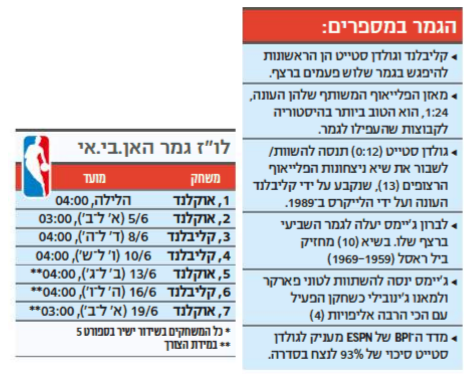 מייק בראון נצמד עם מכוניתו לאוטובוס של סן אנטוניו, מנצל את הליווי המשטרתי כדי לחמוק מהפקקים לפני משחק 2 של גמר המערב לפני שבועיים, כשלפתע לא פחות משלוש ניידות הורו לו לעצור. "אני המאמן בפועל של גולדן סטייט", אמר והצביע על הסמל שבחולצתו, מתגאה בחזרתו למרכז הבמה בחסות גבו הפצוע של סטיב קר. אל מסיבת העיתונאים שלפני המשחק כבר הגיע באיחור, אבל לפחות עם סיפור טוב. נדמה שרק דבר אחד בפלייאוף הנוכחי היה יכול לחסום את דרכם של הווריורס אל הגמר: המשטרה. וגם היא נכשלה.