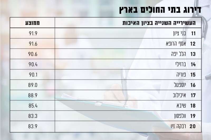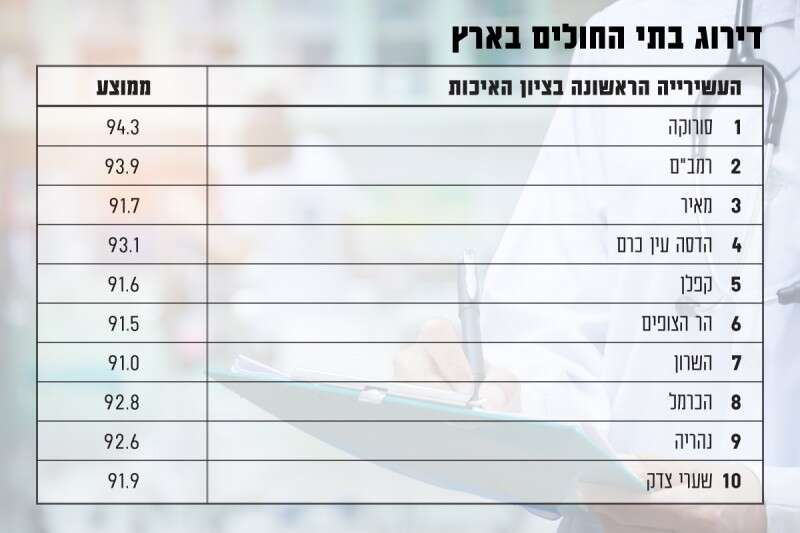 עוד בחמישייה הפותחת של בתי החולים בישראל: הדסה עין כרם (93.1) וקפלן (91.6).