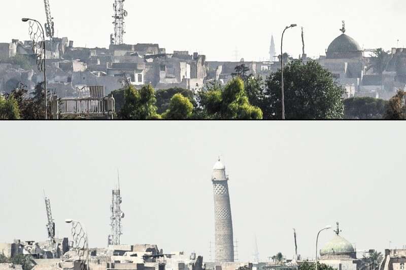מסגד א־נורי, לפני ואחרי ההרס // צילום: אי.אף.פי