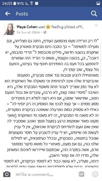 הפוסט שעלה גרר תגובות רבות בהן של שחקניות שכתבו לי, הן בפרטי והן על הדף באופן פומבי כי היא הקפידה לעלוב בהן, להטיח בהן לא רק בכתב, אלא גם בעל פה, לאחר הצגה, כי עליהן לרדת במשקל. התגובות הרבות והשיח שהתעורר גרם להתערבות של ארגון השחקנים שח"ם שהעלה לרשת את הפוסט הבא: "לו רק הורידה מעט מהמטען העודף, היתה גם מצליחה".