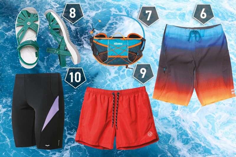 6. מכנסי גלישה - בילבונג, המחיר: 329.90 ש', 7. פאוץ' עם מימייה "HIPSTER WAVE" - שורש, המחיר: 299 ש', 8. סנדלים המתאימים גם למים - KEEN ,המחיר: 469 ש', 9. מכנסי גלישה לגברים - לי קופר, המחיר: 79.90 ש', 10. טייטס שחייה - ARENA , המחיר: 149.90 ש'.