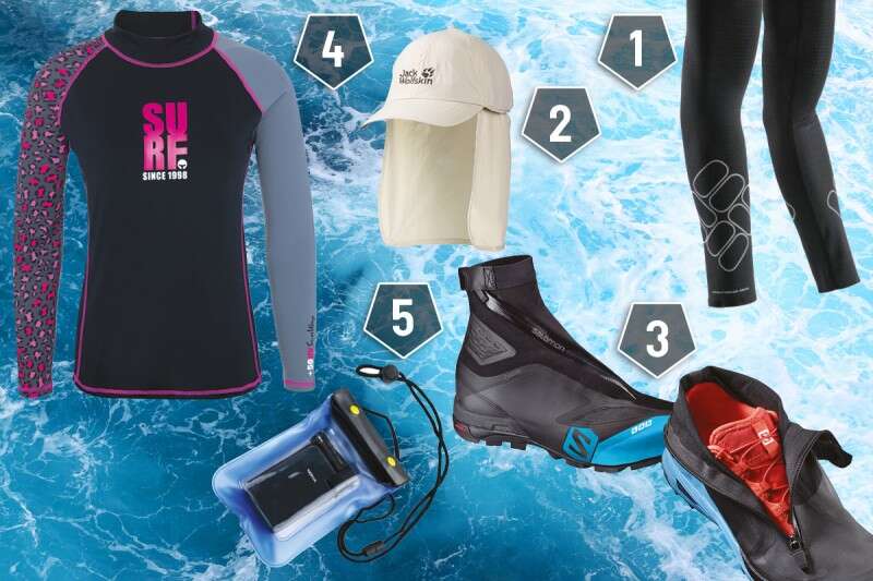 1. שרוולי ידיים מקררים - קולומביה, המחיר: 129.90 ש', 2. כובע מצחייה ומגן צוואר - ריקושט, המחיר: 159 ש', 3. נעלי הליכה עם כיסוי למים - סלומון, המחיר: 1,300 ש', 4. חולצת גלישה חוסמת קרינה - SUNWAY המחיר: 199 ש', 5. נרתיק עמיד למים לנייד עם יציאה לאוזניות - ממסי, המחיר: 29.90 ש'