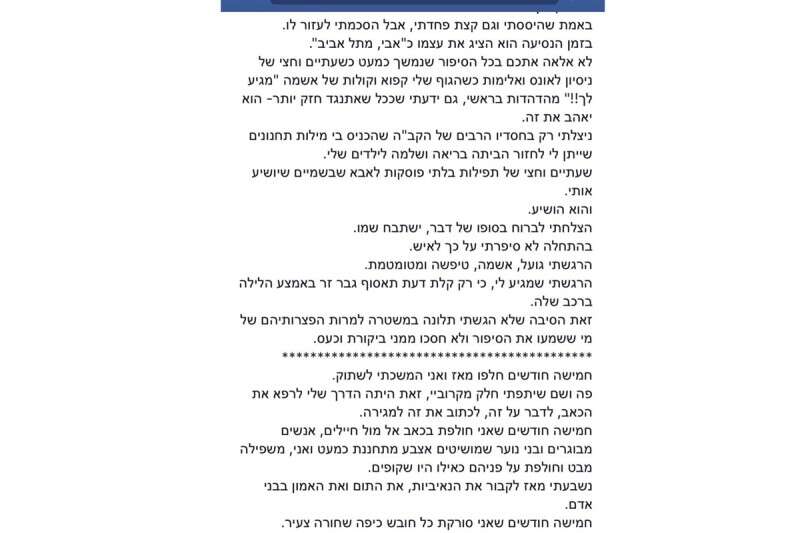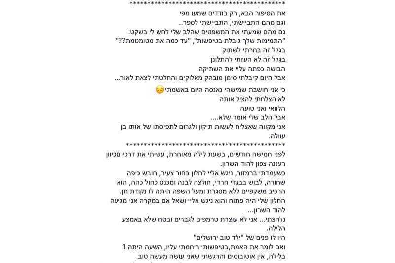 "התביישתי לספר, פחדתי להתלונן, החלון שלי היה פתוח והוא שאל אם אני מגיעה להוד השרון. ריחמתי עליו בשעה 1 בלילה. היו לו פנים של "ילד טוב ירושלים"