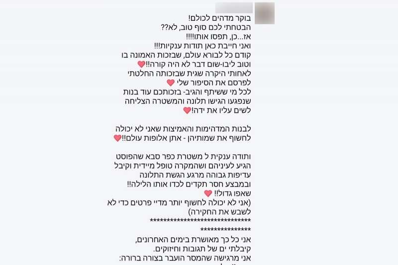 "בוקר מדהים לכולם, הבטחתי לכם סוף טוב, נכון - תפסו אותו. לכל מי ששיתף והגיב, בזכותכם עוד בנות שנפגעו הגישו תלונה והמשטרה הצליחה לשים עליו את ידה!", כך כתבה בפייסבוק הצעירה לאחר ששמעה שהחשוד נתפס.