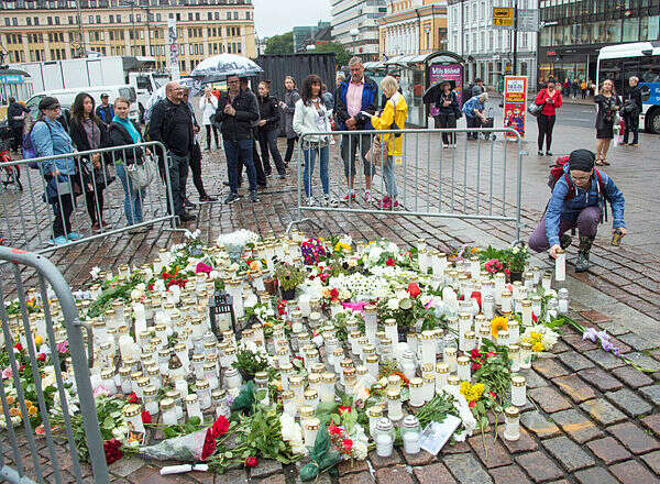 פינת זיכרון מאולתרת בפינלנד בזירת הפיגוע // צילום: אי.פי.אי