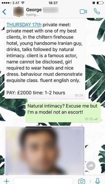 בהמשך פנה אליה סוכן נוסף, שהזדהה רק בשם ג'ורג', עם הצעה בוטה אף יותר, לבקר מיליונר ממוצא איראני "צעיר ונאה". כשאיגר השיבה כי היא דוגמנית ואינה עוסקת בזנות, אמר לה ג'ורג' כי "זה דבר שיגרתי ביותר. כולן בתעשייה עושות את זה".