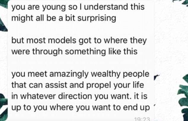 הצעירה האוסטרית מספרת כי אחת מסוכנויות הדוגמנות המפורסמות בעולם פנתה אליה עם הצעה לספק שירותי מין. היא טוענת כי בתחילה ההצעות היו מרומזות. היא הוזמנה ללוות שחקן מוכר לאירוע חברתי נוצץ, ונאמר לה כי תצטרך "לחוש בנוח עם אינטימיות".