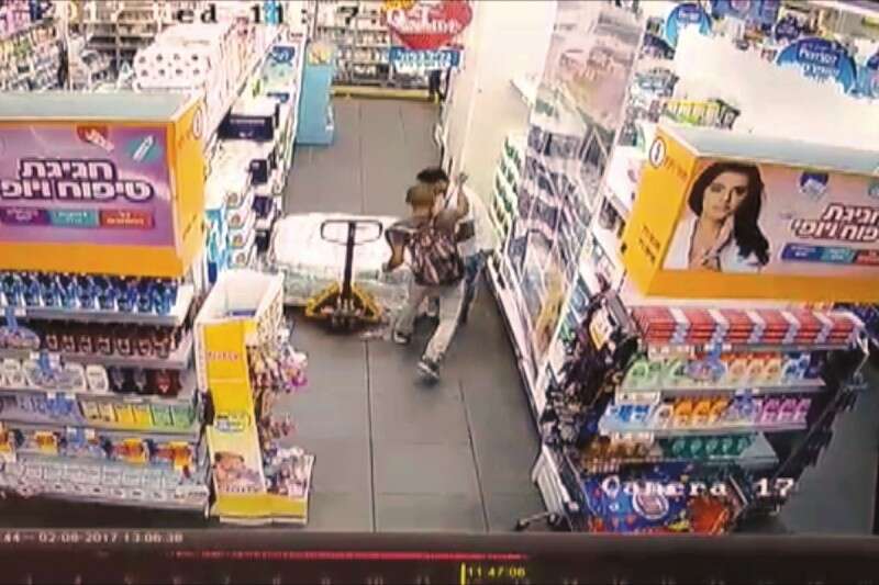 ניב עמד באותה עת במעבר בין מדפי הפארם וסידר על המדפים חבילות של נייר טואלט. בסרטון הוא נראה מביט במחבל כשזה עובר לידו, וממשיך בשלו.