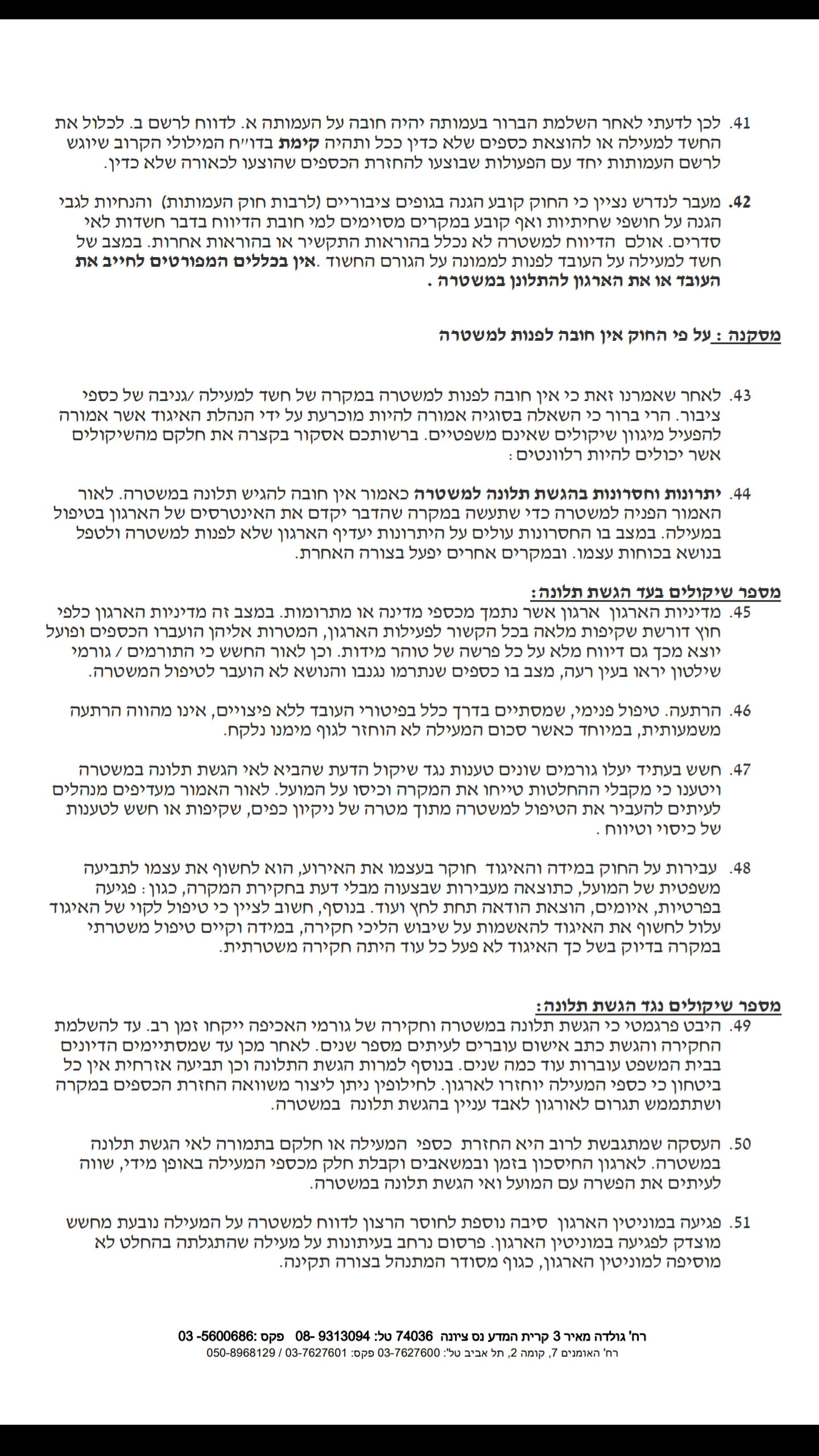 בדו"ח הפנימי שנכתב על ידי היועץ המשפטי של האיגוד והגיע בלעדית לידי "ישראל היום" נכתב בין השאר: "על פי החוק, אין חובה לפנות למשטרה", אך בהמשך נכתב: "מדיניות הארגון כלפי חוץ דורשת שקיפות מלאה בכל הקשור לפעילות הארגון, המטרות שאליהן הועברו הכספים ופועל יוצא מכך גם דיווח מלא על כל פרשה של טוהר מידות. וכן לאור החשש כי התורמים/גורמי שלטון יראו בעין רעה מצב שבו הכספים שנתרמו נגנבו והנושא לא הועבר לטיפול המשטרה. האיגוד, אם יחקור בעצמו, יכול להיות חשוף לתביעה מצד המועל".