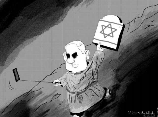 הפעם, לא מדובר בקריקטורה אנטישמית, אלא במשהו שנדמה למעמד הר סיני שכן ראש הממשלה נתניהו מחזיק את מה שנראה כלוחות הברית ועליהן מגן דוד, ובידו השנייה "מוט סלפי" אליו מחובר מכשיר סלולרי.