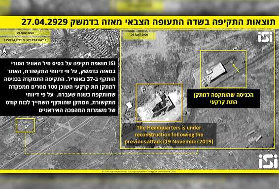 חברת המודיעין הלווייני Imagesat International חשפה היום (חמישי) את נזקיהן של שתי תקיפות המיוחסות לישראל בשטחה של סוריה והעריכה כי היעדים שהותקפו הם מפקדה תת קרקעית של כוח קודס של משמרות המהפכה בבסיס חיל האוויר מאזה בדרום דמשק ומחסן אמצעי לחימה מתקדמים בעיירה אל שוכנה, סמוך לעיר תדמור.